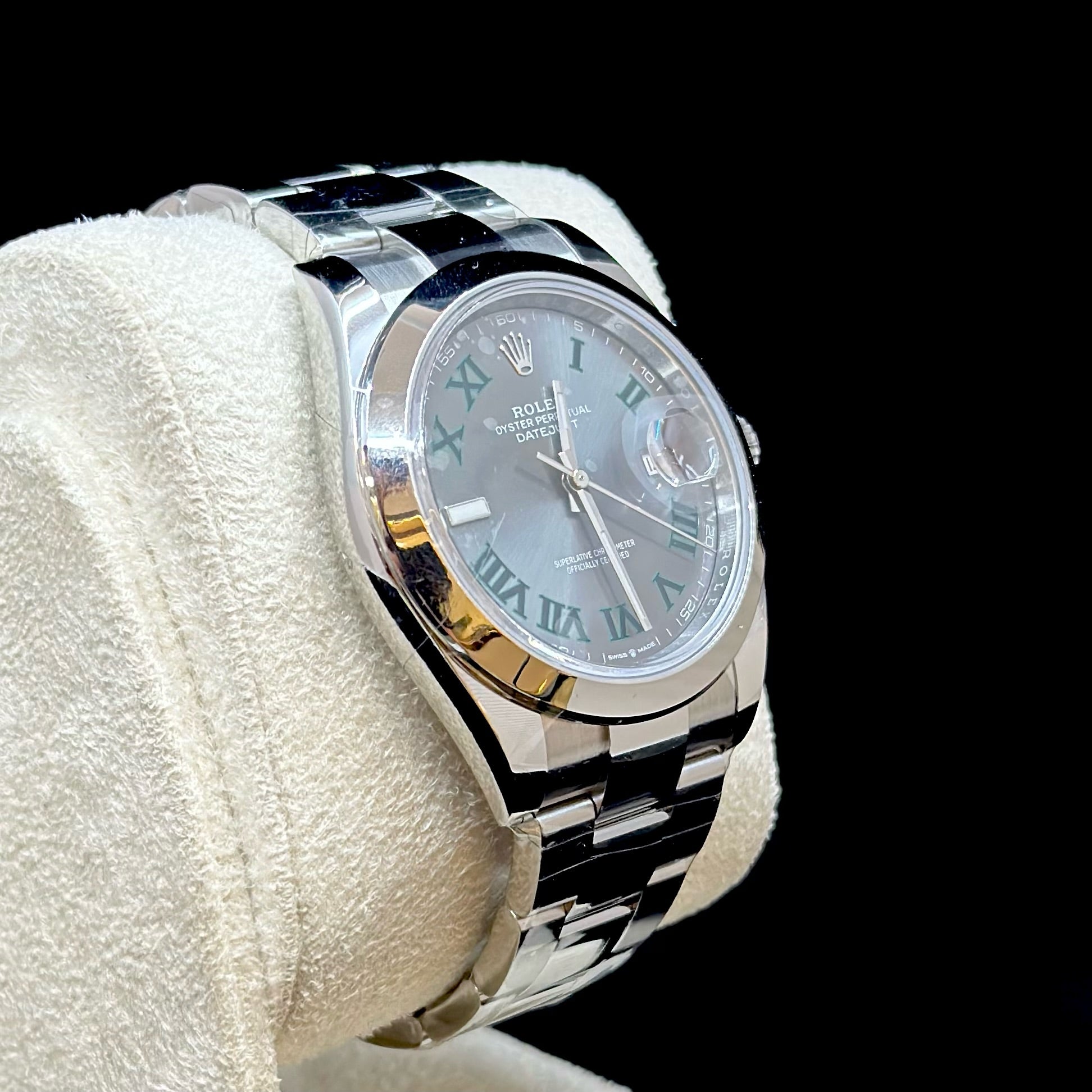 Discover the Rolex Datejust 36 126300, a watch that perfectly blends timeless elegance with modern sophistication. This exquisite timepiece is crafted from high-grade stainless steel, featuring a smooth bezel that adds a touch of understated luxury to its classic design. The Wimbledon dial, with its slate grey finish and Roman numeral hour markers outlined in green, ensures excellent readability and a refined, contemporary look.