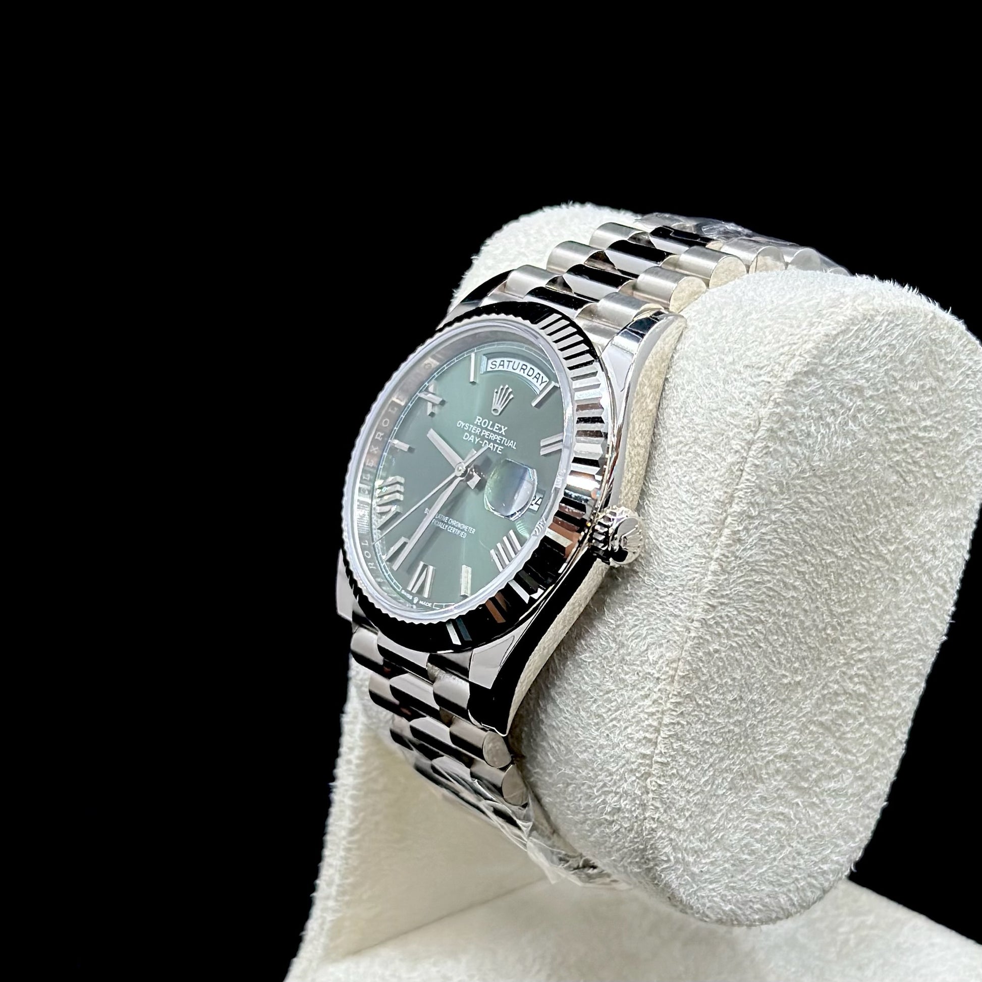 Discover the Rolex Day-Date 40 228239, a watch that embodies timeless elegance and exceptional craftsmanship. This luxurious timepiece is crafted from 18k white gold, featuring a distinctive fluted bezel that adds a touch of sophistication to its iconic design. The green olive dial, adorned with Roman numeral hour markers, ensures excellent readability and a striking, refined look.